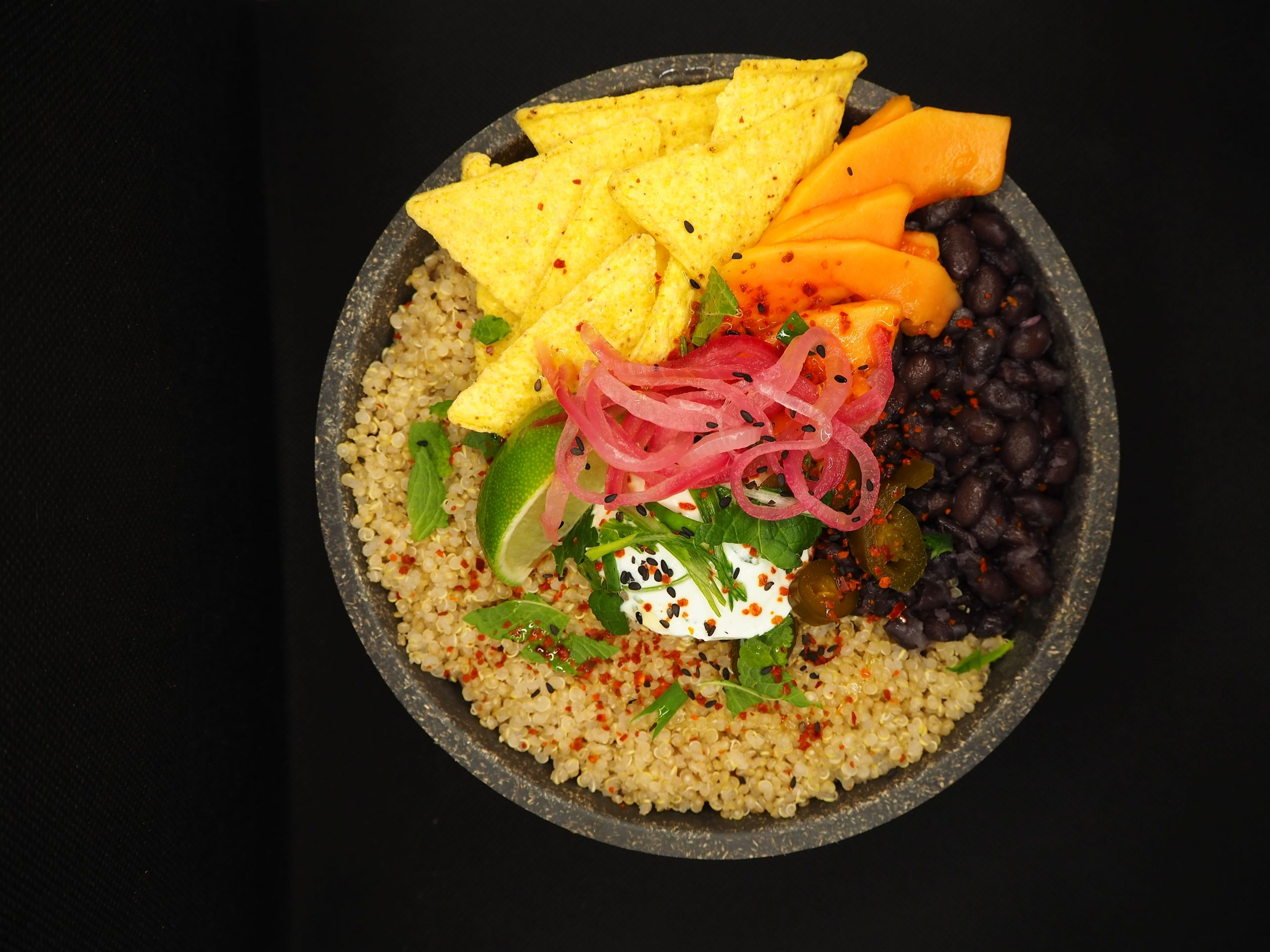Black bean stew, quinoa, papaya, mint–lime yogurt, pickled jalapeños, tacos, pickled red onion, mint, lime, black sesame. Allergens: Lactose, sesame