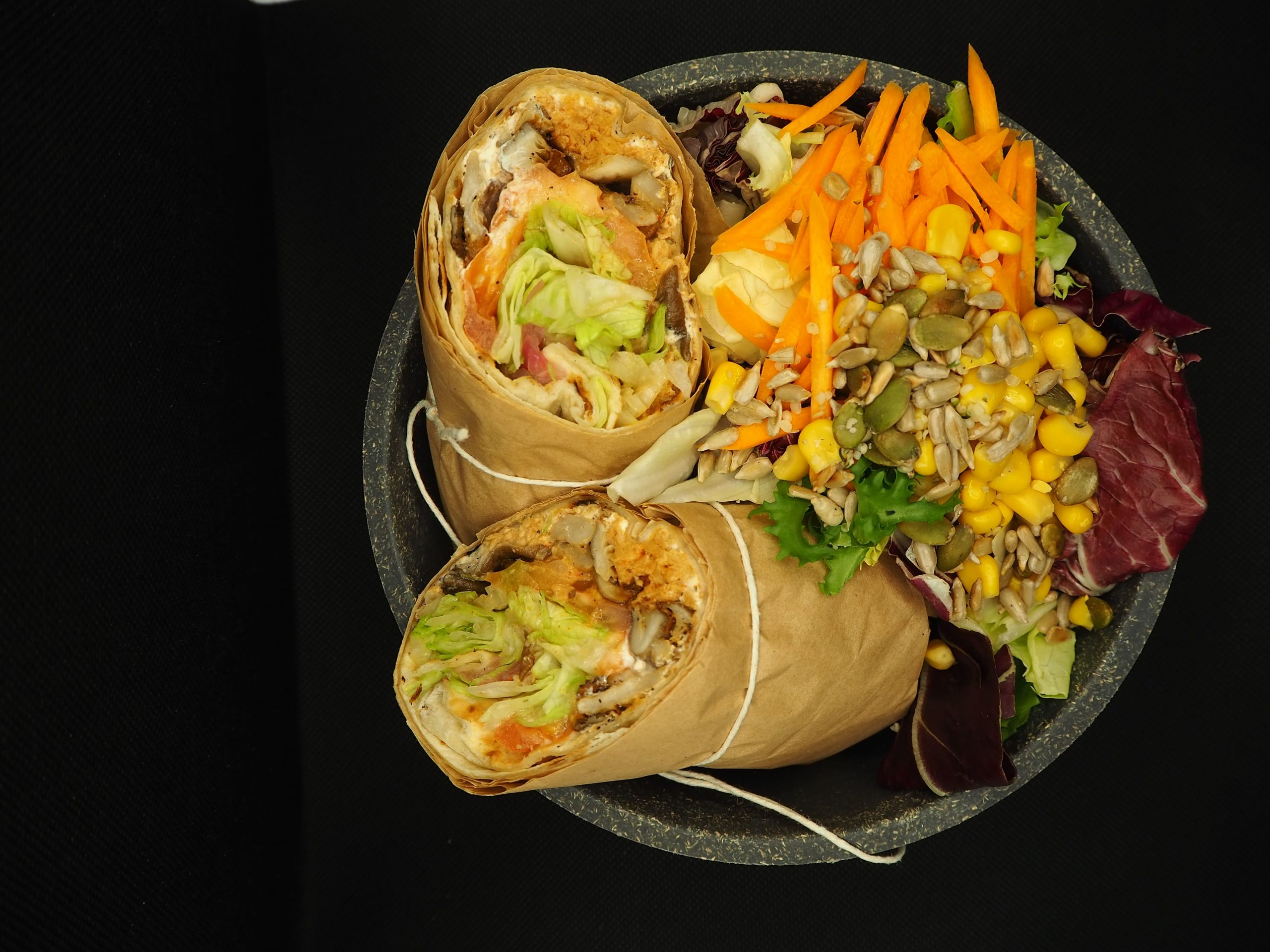 Wrap, ranch sauce, oyster mushrooms, marinated pea granules, tomato, lettuce, pickled red onion. Allergens: Gluten, mustard Side: Mixed leaf salad, corn, carrot, mix of roasted pumpkin seeds, sunflower seeds and hemp seeds, balsamic dressing