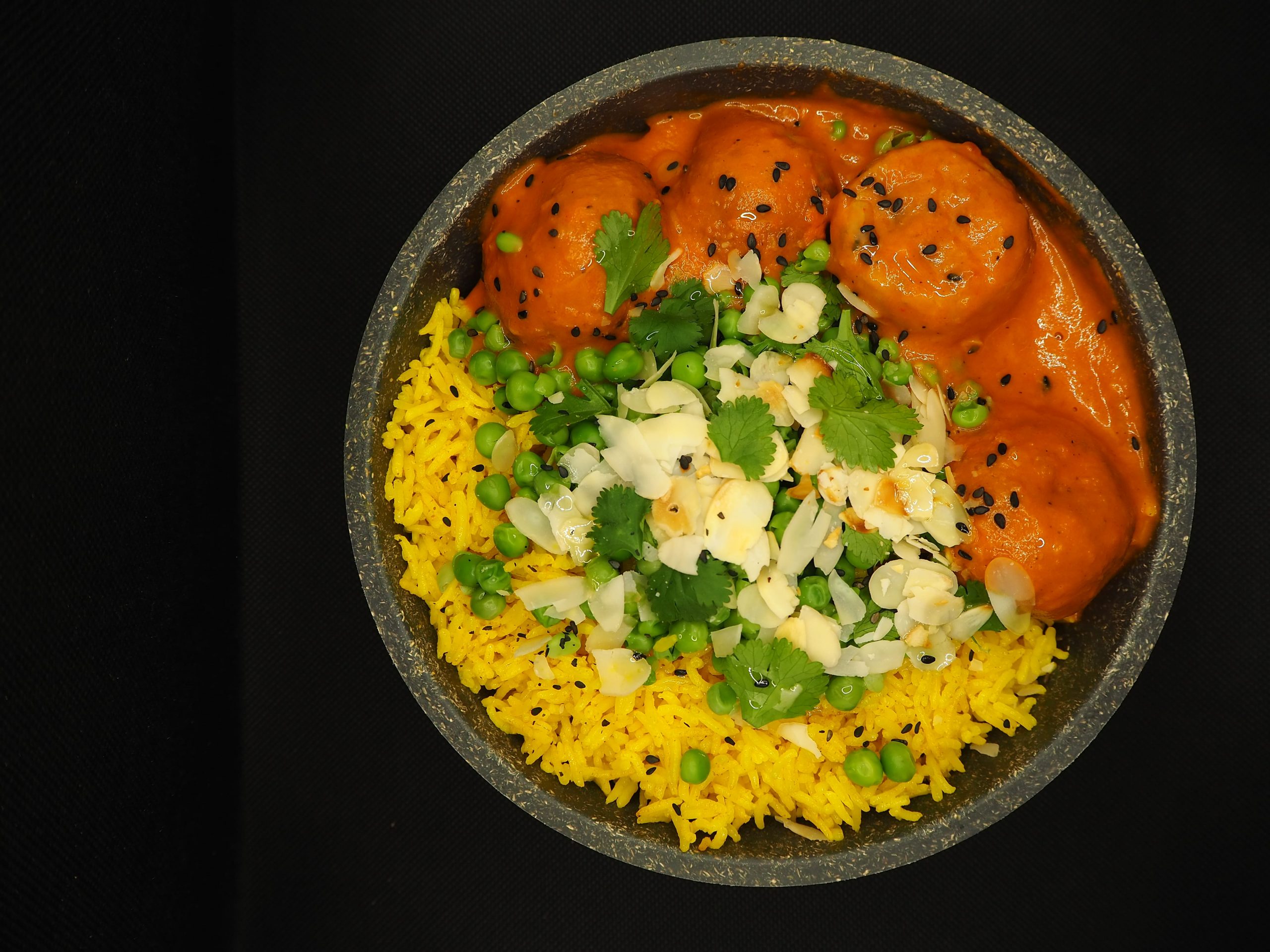 Potato–tofu dumplings in tomato curry sauce, turmeric rice, peas, coriander, almond flakes, black sesame. Allergens: Nuts, soy, sesame