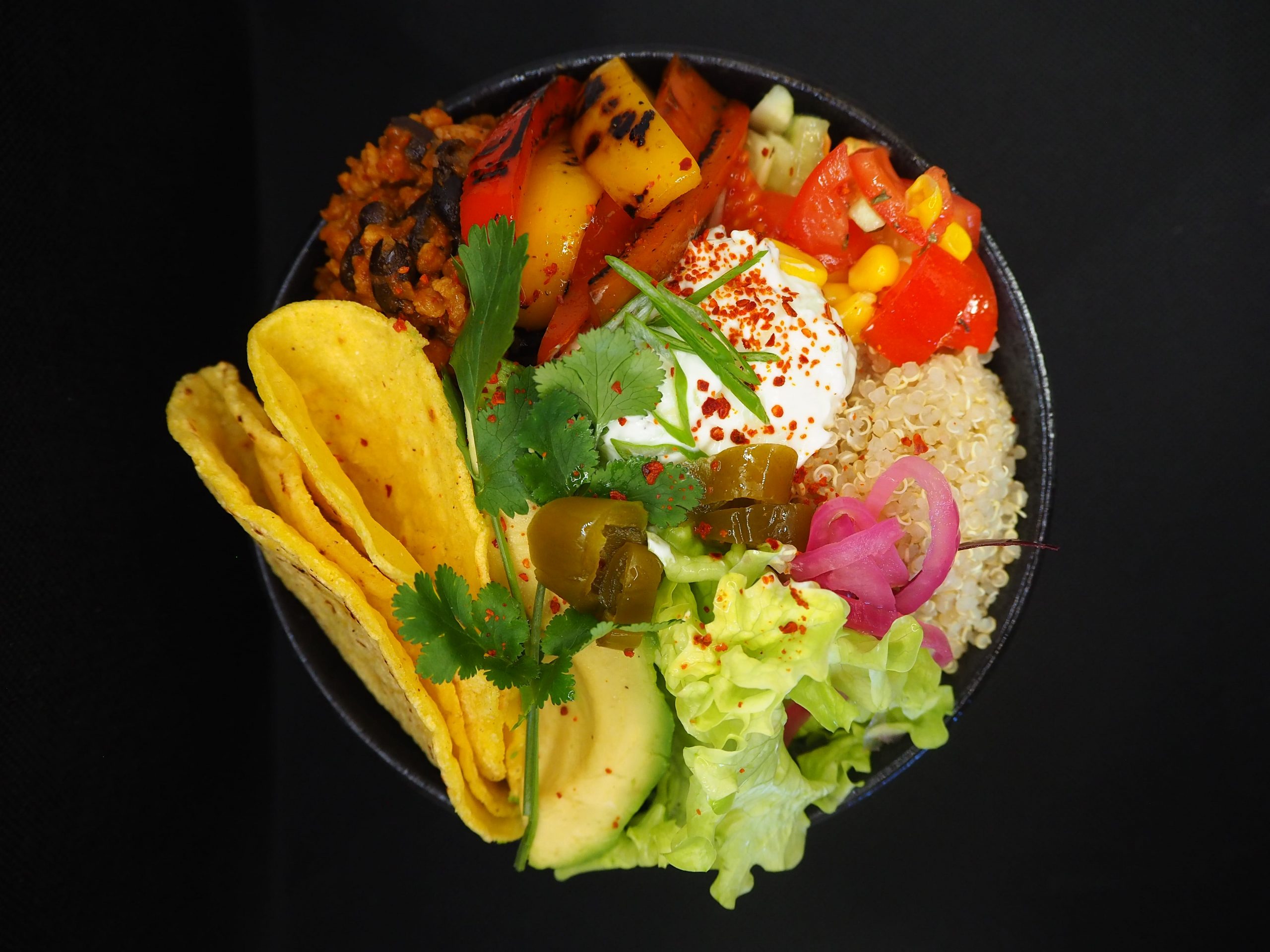 Hausgemachte Tortillas aus Maismehl mit Salat, Jalapeños, Bohneneintopf mit Veggie-Hack, Gurken-Joghurt mit Minze, Avocado, gepickelter roter Zwiebel, Quinoa, Frühlingszwiebel, gegrillter Paprika sowie Gurken-Mais-Tomaten-Mix. Allergene: Laktose