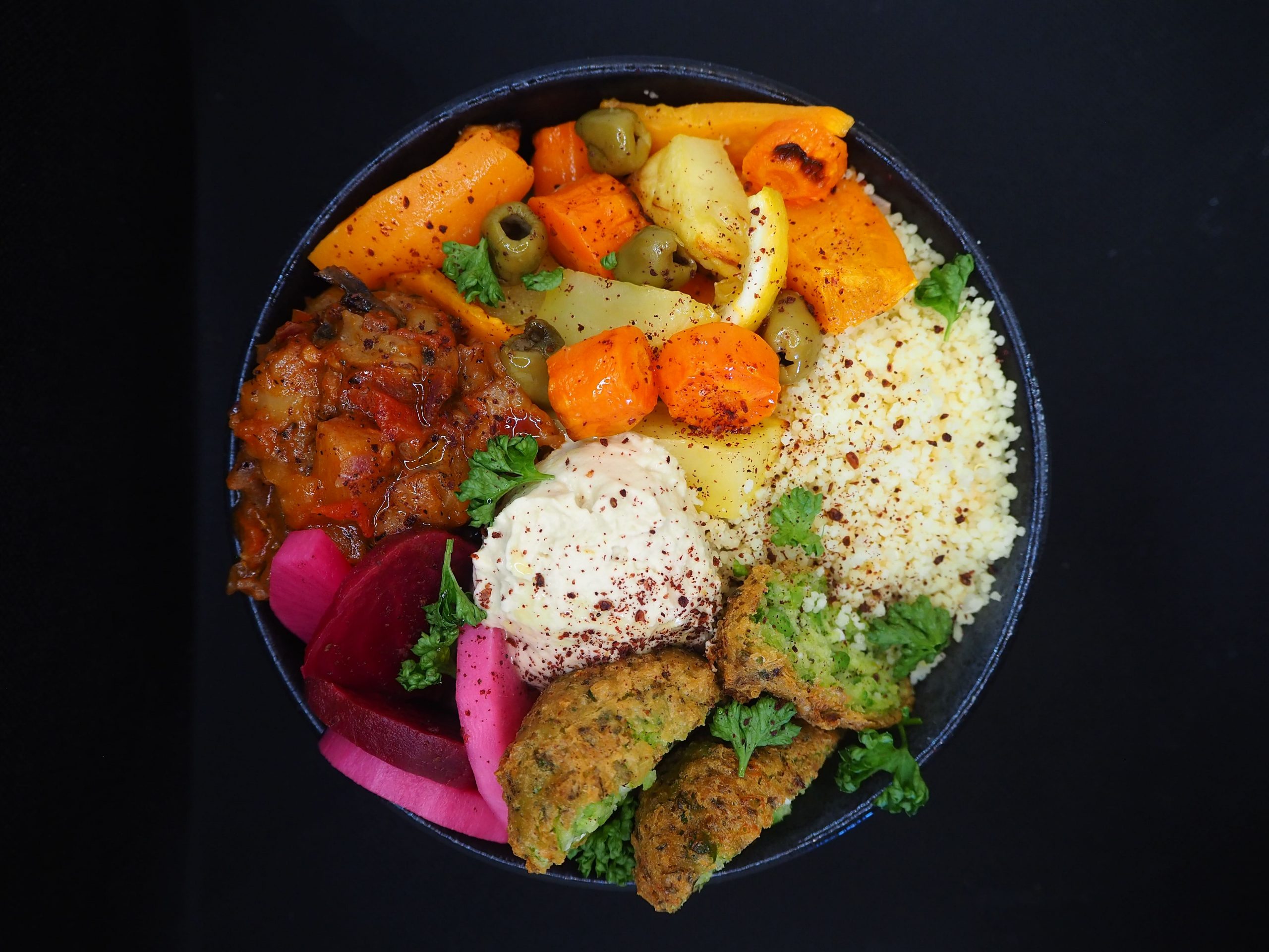 Couscous mit Ofengemüse aus Karotte, Süßkartoffel und Kartoffel, grünen Oliven und Zitrone, dazu Hummus, gepickelter Rettich und Rote Bete, geschmorte Aubergine mit Tomate, Erbsen-Zaatar-Feta-Minze-Patties, Petersilie und Sumach. Allergene: Gluten, Laktose, Sesam